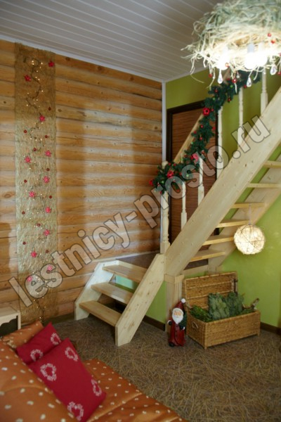 Классическая деревянная лестница с удобным забежным поворотом. Лестница без какого-либо покрытия. В комплекте элементы лестницы и ограждения в разобранном виде, необходимый крепеж, инструкция по сборке.