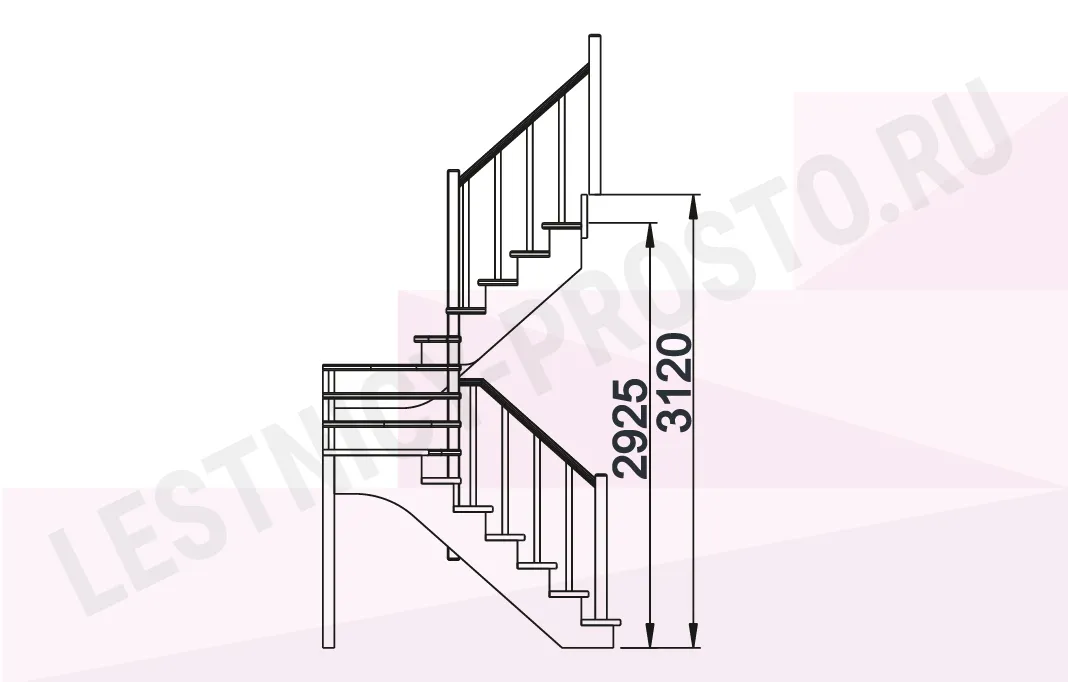 Ограждение лестницы с одной стороны. Базовый комплект включает в себя деревянные элементы лестницы и ограждения без какого-либо покрытия.