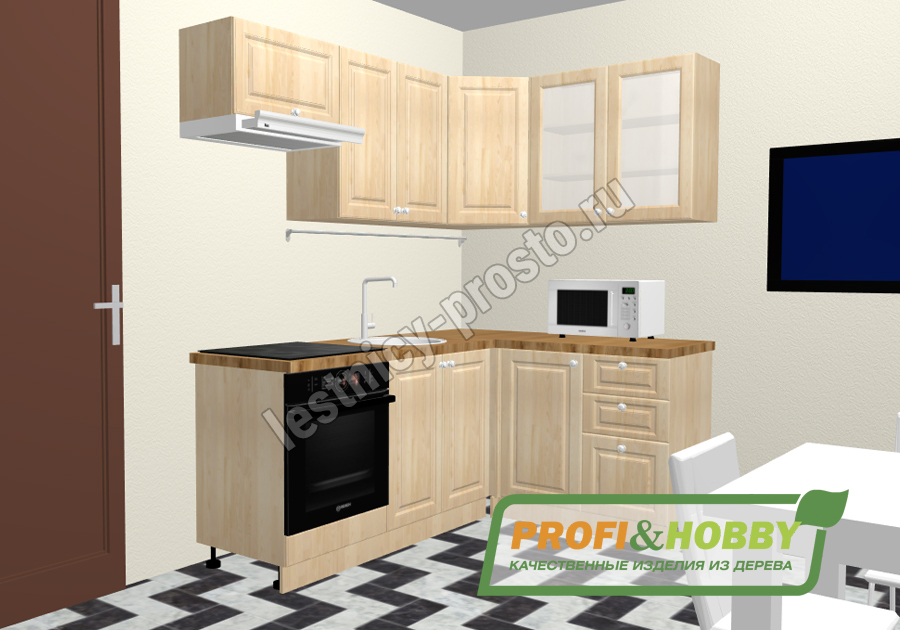 Угловой кухонный гарнитур из 100% массива сосны размером 2 на 1,4 и высотой 2,14 метра (верхние шкафчики 72 см). Благодаря модульной системе такая кухня может быть собрана зеркально, а, например, верхние шкафчики "под стекло" и "глухие" заменены местами. В стандартной комплектации нижние тумбы оснащены регулируемыми ножками высотой 100 мм и цоколем из массива сосны 95 мм.
