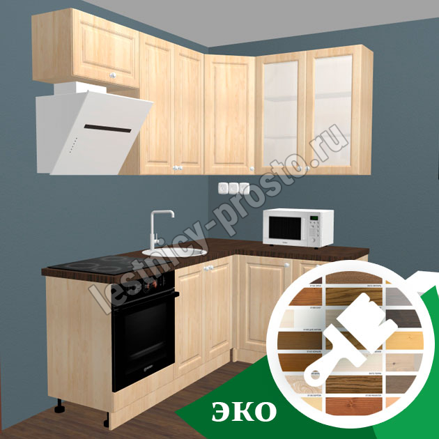 Угловой кухонный гарнитур из 100% массива сосны размером 2 на 1,4 и высотой 2,32 м (в данном проекте использованы высокие верхние ящики 90 см). Цвет на выбор - более 20 вариантов (при заказе кухни в нашем интернет магазине просьба указывать название цвета в комментариях).