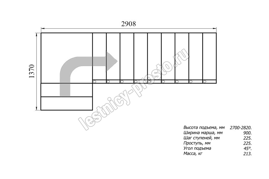 Модульная лестница Статус 225 2700-2820, Серый, Лиственница, Нержавеющая сталь