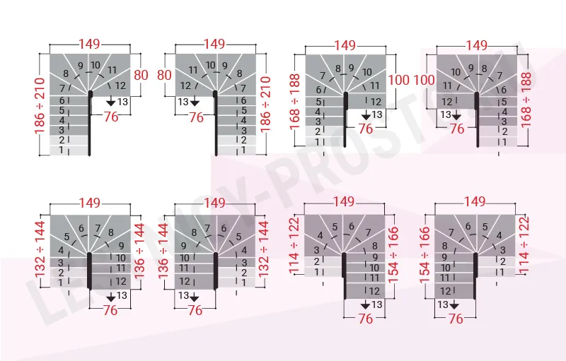 При монтаже этой лестницы, возможно регулировать высоту и глубину шага, таким образом можно получить лестницу под высоты этажа в диапазоне 2250 - 3030 мм, кроме того, установив дополнительный комплект увеличения высоты, можно поднять высоту лестницы до 3730 мм.