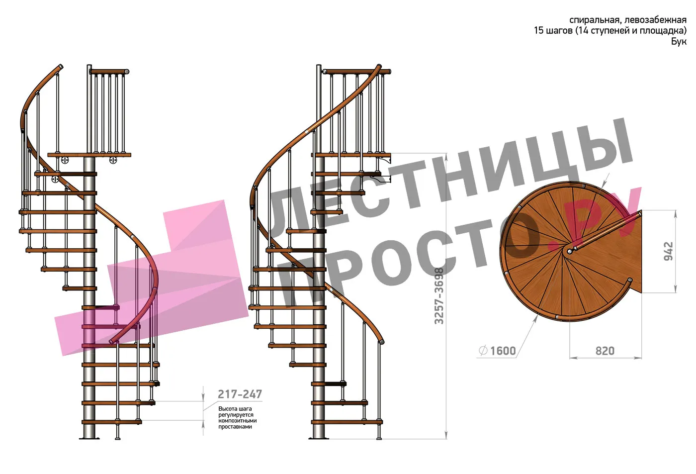 Винтовая лестница Prosto Spiral Black D160см, h325.7-369.8 см, бук