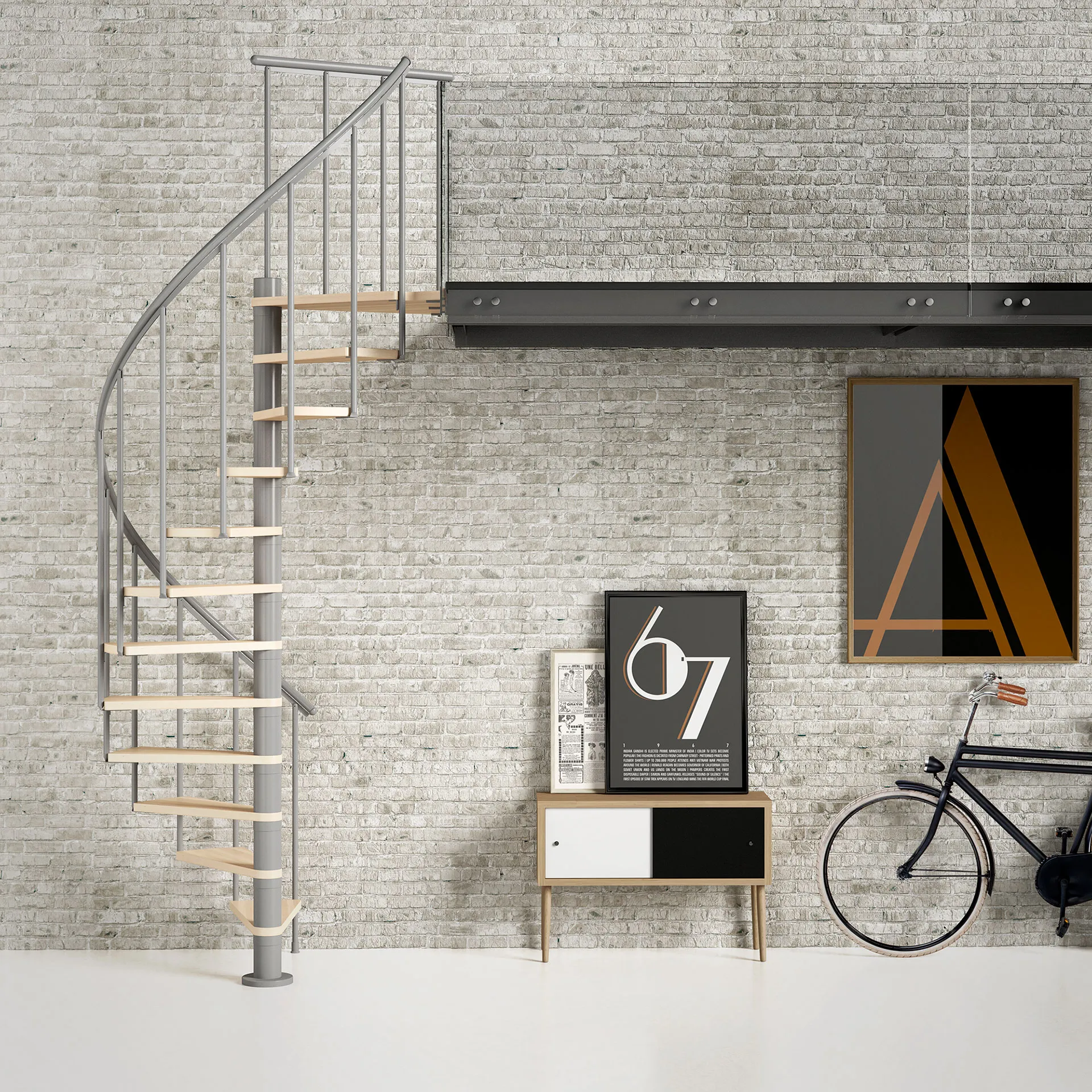 Лестница представлена в двух вариантах: с поворотом направо и с поворотом налево. Благодаря возможности регулировать высоту шага с помощью пластиковых вставок (входят в базовый комплект), высоту лестницы можно варьировать в пределах от 2860 до 3090 мм. Кроме того, купив дополнительную секцию для этой лестницы, можно поднять высоту до 3320 мм. Поручень изготовлен из массива бука в тон ступеням. Ступени и поручень покрыты износостойким защитным лаком.
